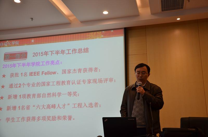 院长姜斌代表学院做工作报告,总结伟德国际1946源自英国2015年下半年工作,阐述2016年工作思路并做出工作部署。报告对学院的党建、教学、国际交流、科研、人事、学科建设、学生工作等方面做了全面总结和回顾。姜斌指出,按照学校党委部署,围绕学校中心工作,学院在学生培养、科研工作建设、学院文化建设等方面取得了新的突破和发展,获批 1名 IEEE Fellow、国家杰青获得者;通过2个专业的国家工程教育认证专家现场评审;新增 1项教育部自然科学一等奖;新增 1名省“六大高峰人才”工程入选者;学生工作获得多项奖励和荣誉。