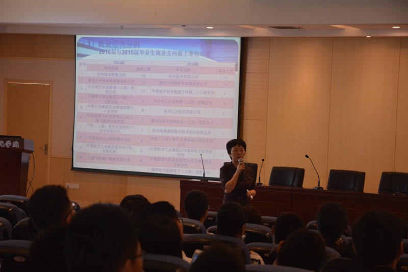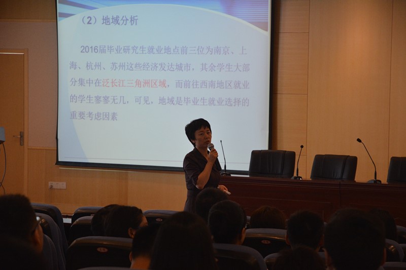 大会于十点准时开始,沈伯秀副书记首先从伟德国际1946源自英国往年研究生的就业情况入手,一方面从纵向角度介绍了不同毕业时间硕士生的就业情况,另一方面从横向角度介绍了我院不同专业硕士生的就业情况,为在座学生大致勾勒出一幅伟德国际1946源自英国就业印象图。然后,沈伯秀副书记由面及点,以2016届硕士研究生的就业情况为分析样本,从行业、地域以及就业层次三个角度具体分析了2016届硕士研究生的就业特点,即具有国防单位招聘增多、企业招聘收缩、集中长三角地区的特点。