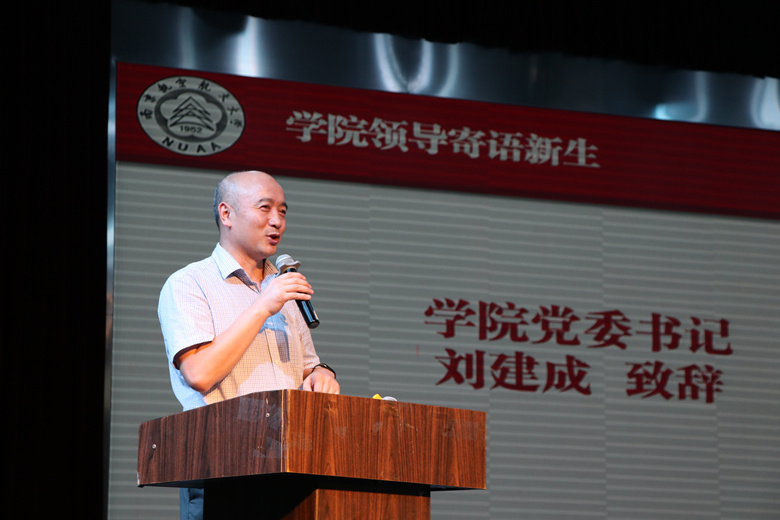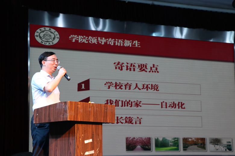 随后,姜斌院长寄语新生。姜院长介绍了南航的光辉历史和发展历程,介绍了学校雄厚的师资力量,并对学院结构、师生情况、人才培养等多个方面进行了详细地介绍。院长寄语新生:希望同学们具备良好的心理素质,以责任、健康、唯实、创新、团结、眼界六个词为核心,建立积极主动的心态,尽早确立目标,打好学习基础,了解自己的专业;在南航的大家庭里追逐理想兴趣,参与社会生活,投身社会实践。