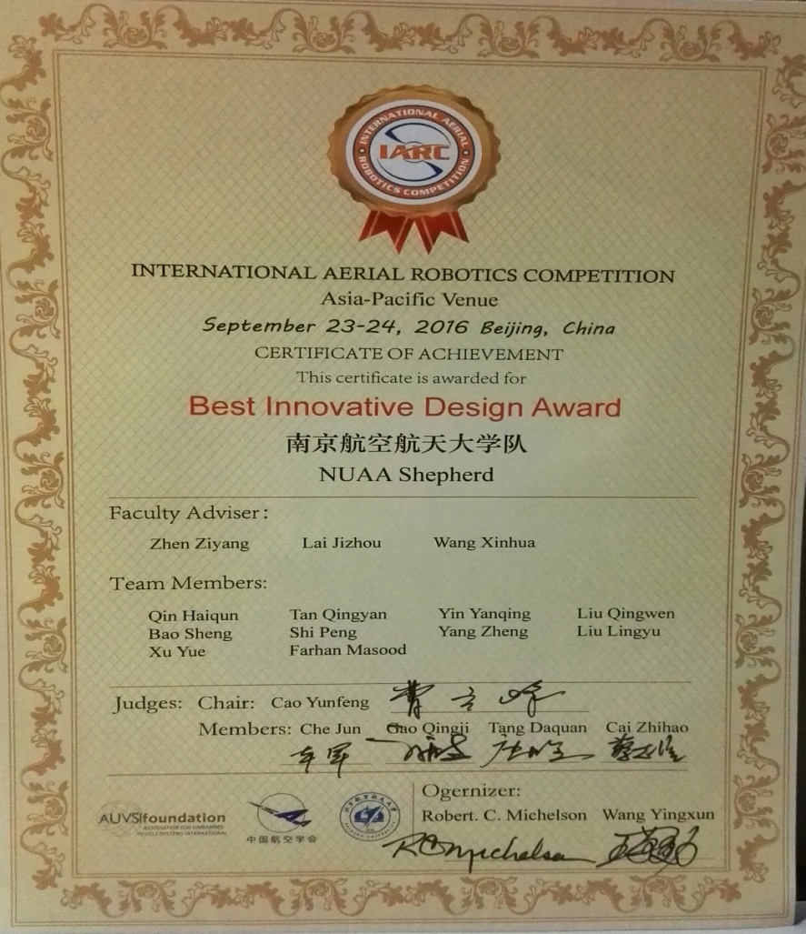 大赛包括技术答辩、静态评判、现场比赛等环节,进行飞行器设计、精确导航、自主控制等方面的创新技术展示。由伟德国际1946源自英国甄子洋副教授、赖际舟教授和王新华副教授等指导的研究生团队(覃海群、谈青艳、尹彦卿、刘青文、包胜、石鹏等)自主研制的六旋翼无人飞行器完成了自主起飞着陆、目标机器人跟踪、室内避障等一系列规定动作,以优异的表现荣获该项赛事的Best Innovative Design Award(最佳创新设计奖)。我院已是连续第三年代表学校参加此项赛事,每年都取得了优异成绩。