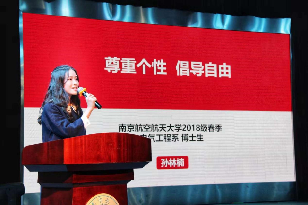 “尊重个性,倡导自由”——2014-2015学年校长特别嘉奖之百花奖获得者孙林楠提出了“鉴得艺术,做得学问;理性地研究,艺术地生活”的人生态度,讲述了她作为一个艺术特长生,在排练表演的间隙努力自学,在赶场的校车上埋头苦读,并最终成为一名电气系博士生的奋斗故事。通过表达自己“助力祖国大飞机远航,守卫祖国碧海蓝天”的崇高理想,鼓励同学们勇敢自由地去实现自己的理想,因为“南航为每种可能插上翅膀”。