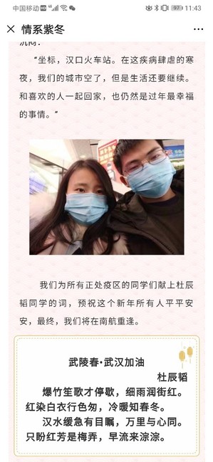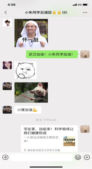 “两周啦,武汉挺住!小朱同学加油!”伟德国际1946源自英国的朱同学每天都能收到同学们的关心话语,她的班长和室友单独为她成立了后援团,每天发送一些疫情相关的正能量的文章,在群内给她加油打气。她的同学说:我们希望她在武汉能安安心心、不孤独,武汉封城了,但我们都在!