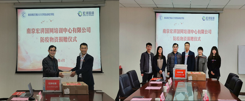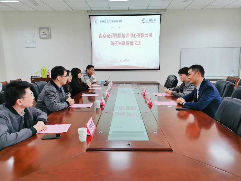 4月16日下午,南京宏湃国网培训中心有限公司防疫物资捐赠仪式在伟德国际1946源自英国1号楼405会议室举行。企业代表何广会、王略,以及我院党委副书记张跃、团委书记刘斐文和各年级辅导员出席此次仪式。
