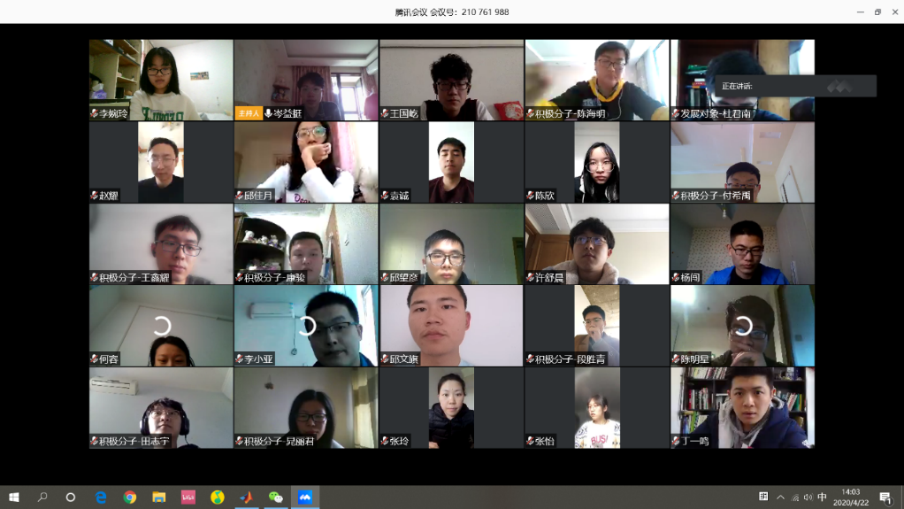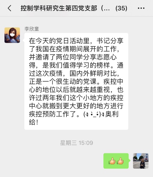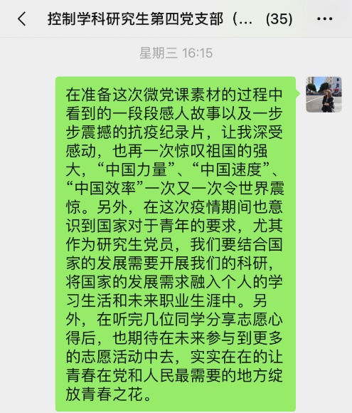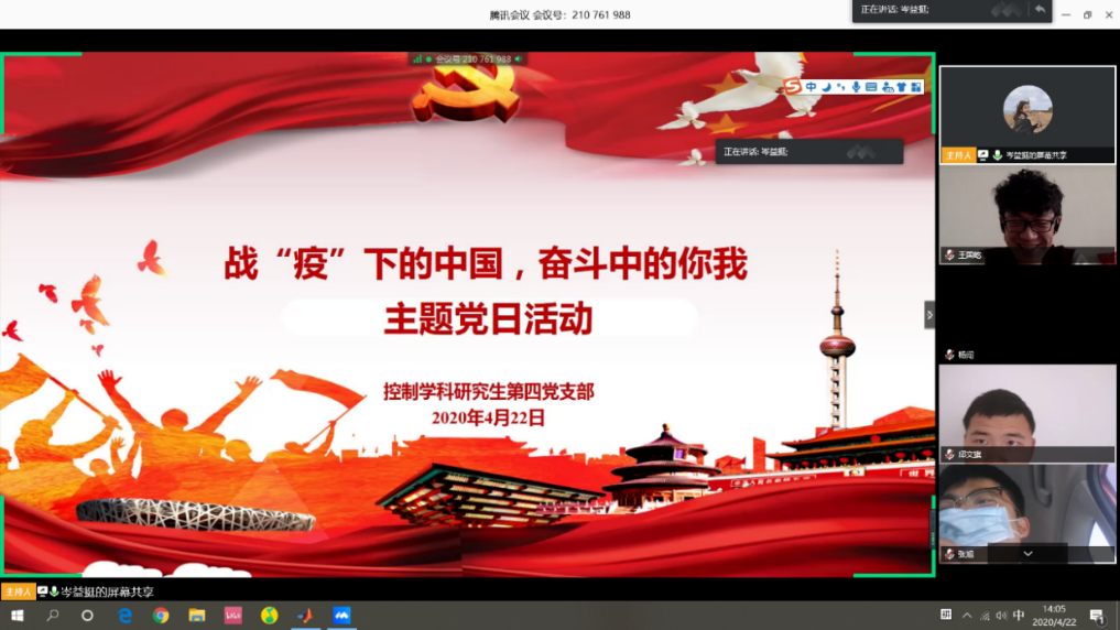 为贯彻中共中央《关于加强党的领导、为打赢疫情防控阻击战提供坚强政治保证的通知》和《新时代爱国主义教育实施纲要》精神,带动学生党员认真学习新冠肺炎疫情防控“大课”,发挥党员先锋模范作用,2020年4月22日下午,伟德国际1946源自英国控制学科研究生第四党支部开展了一场以“战‘疫’下的中国,奋斗中的你我”为主题的线上党日活动,支部党员、发展对象、积极分子共计41人参加了本次活动。该党支部由学院教职工张玲老师担任支部书记,本次活动参与人员均为导航研究中心研究生。